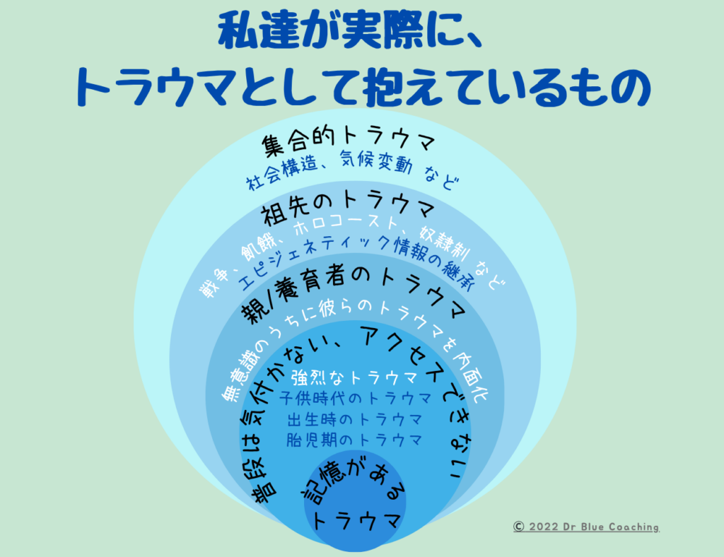 更にその外には「先祖のトラウマ」があります。その中には、戦争、飢餓、ホロコースト、奴隷制度から来るトラウマが含まれます。日本も、第2次世界大戦では空襲や原爆被害を受け、戦中戦後は食糧不足にも苦しみました。実はトラウマは、エピジェネティック(DNAの変化を伴わない細胞分裂後も継承される遺伝子発現あるいは細胞表現型の変化)な変化 をもたらし、少なくとも4世代、受け継がれていくと言われています 。